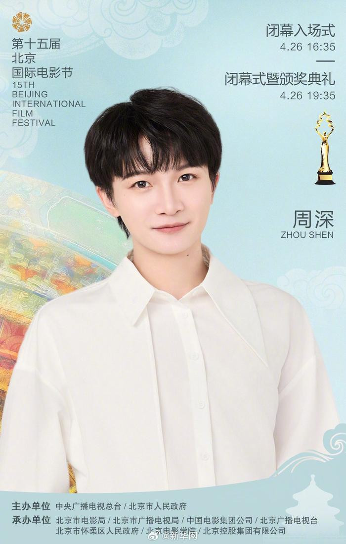 [官宣!#北影节闭幕式第二轮阵容来了#]第十五届@北京国际电影节闭幕式第二轮阵容官宣:@卡布叻_周深、@陈冲、@姜文电影官微、@倪妮V、@倪萍、田华等共同见证光影闪耀时刻。4月26日,期待“天坛奖”奖项揭晓!#北京国际电影节闭幕式阵容来了##周深将亮相北影节闭幕式#